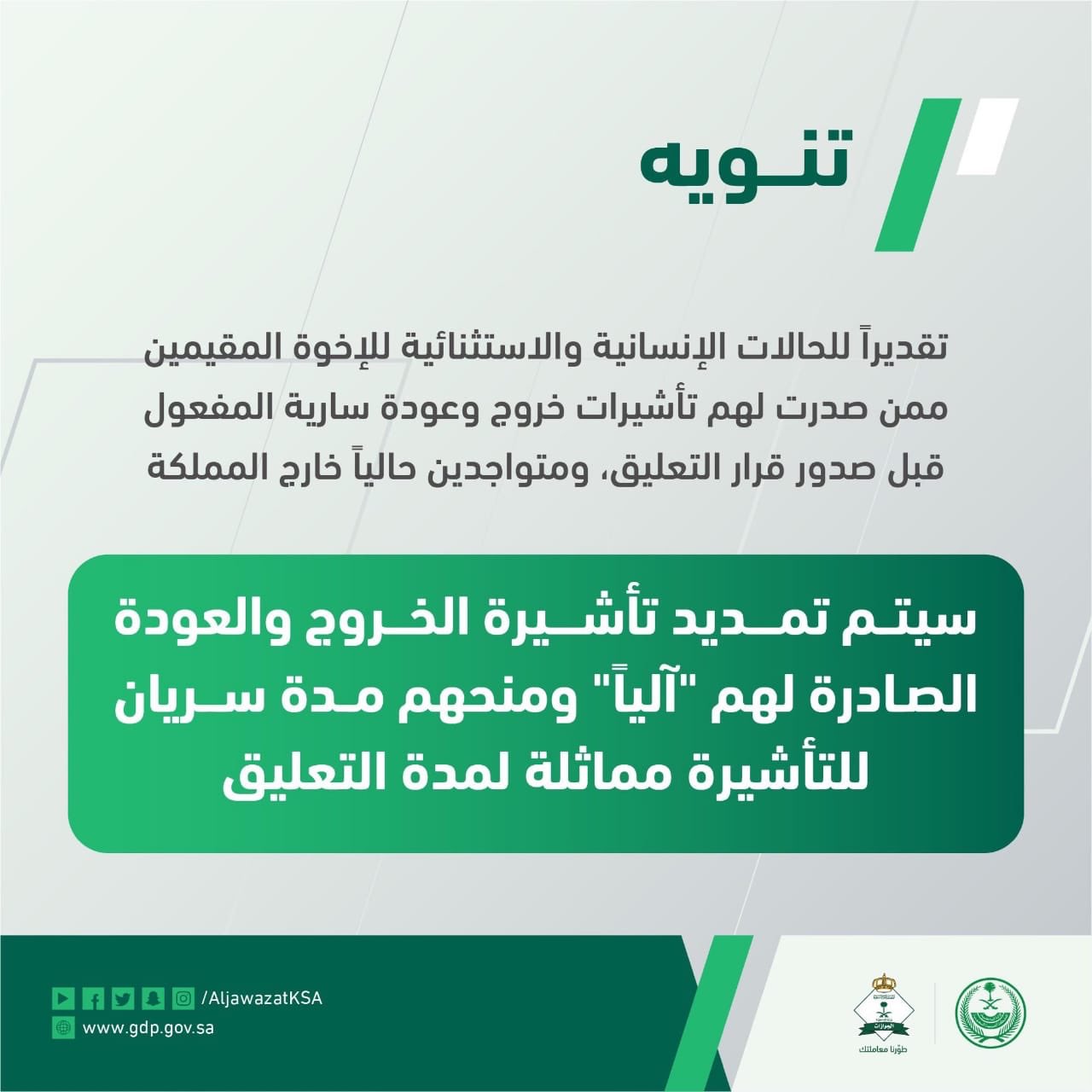 تمديد تأشيرات الخروج والعودة وتوضيح هام من الجوزات السعودية مغترب أون لاين